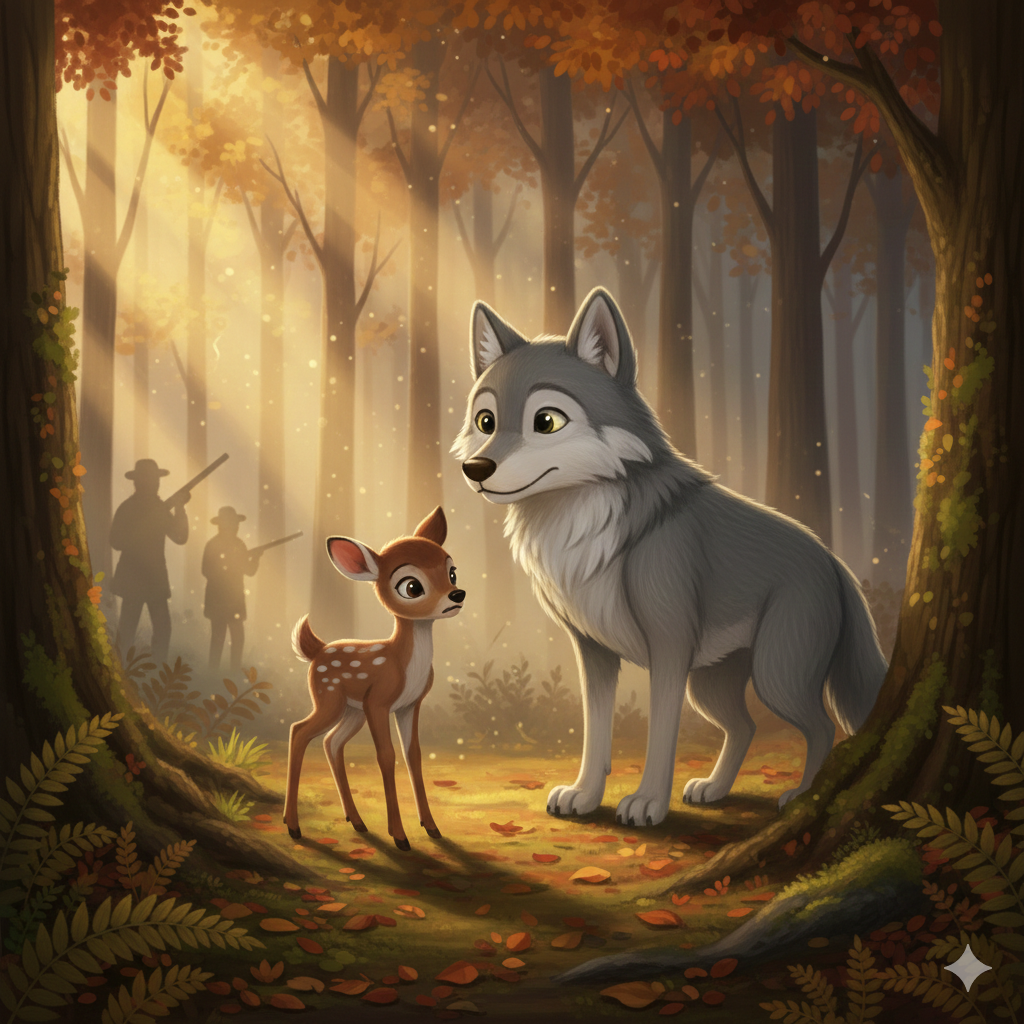 Grisou n’était pas comme les autres loups. Contrairement à ce que tout le monde pensait, il ne faisait de mal à personne. Il avait un cœur doux et protecteur. Il détestait voir les animaux de la forêt effrayés, surtout après ce qu'avaient fait les chasseurs. Il savait qu’Eddy, le petit faon, avait besoin de protection.