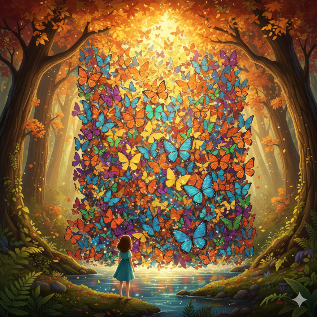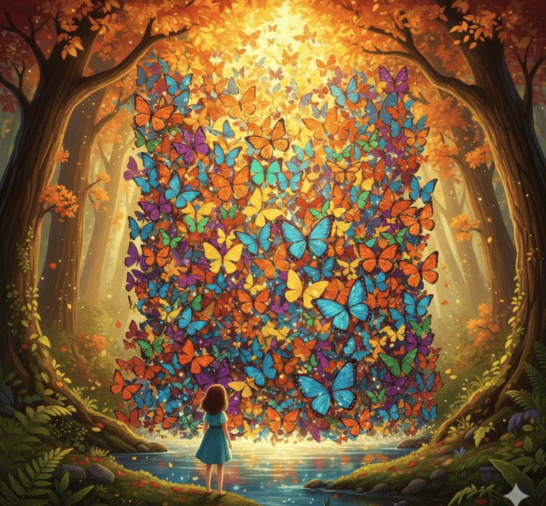 Chaque matin, Mila se rendait au cœur de la prairie, près d’un grand arbre aux branches étalées. Là, elle chantonnait une douce mélodie que seuls les papillons et les libellules semblaient comprendre. À peine commençait-elle à chanter que des dizaines de papillons aux couleurs éclatantes apparaissaient, battant joyeusement des ailes autour d’elle. Les libellules, avec leurs ailes fines et scintillantes, se joignaient à ce ballet aérien.