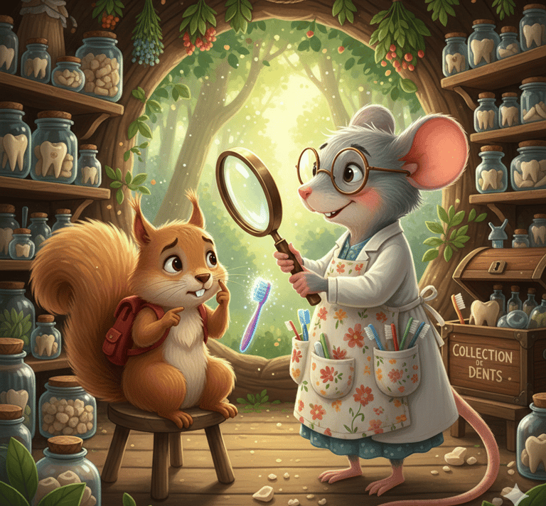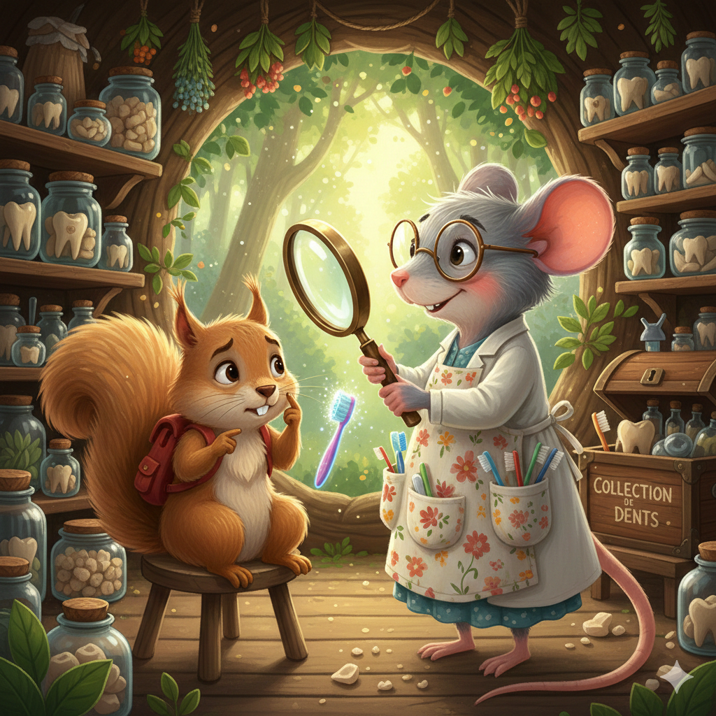 Sa maman l’emmena voir Madame la Souris, la spécialiste des dents de la forêt. Elle portait une grande loupe et un tablier rempli de brosses colorées.