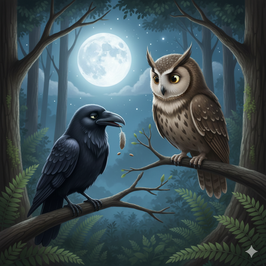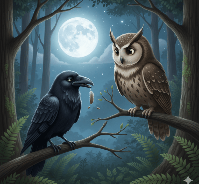 Mais un jour, Maître Hibou, qui vivait dans un grand arbre au centre de la forêt, en eut assez. Il en avait assez de voir les animaux effrayés pour rien. Alors, il décida de donner une bonne leçon à Croa-Croa.