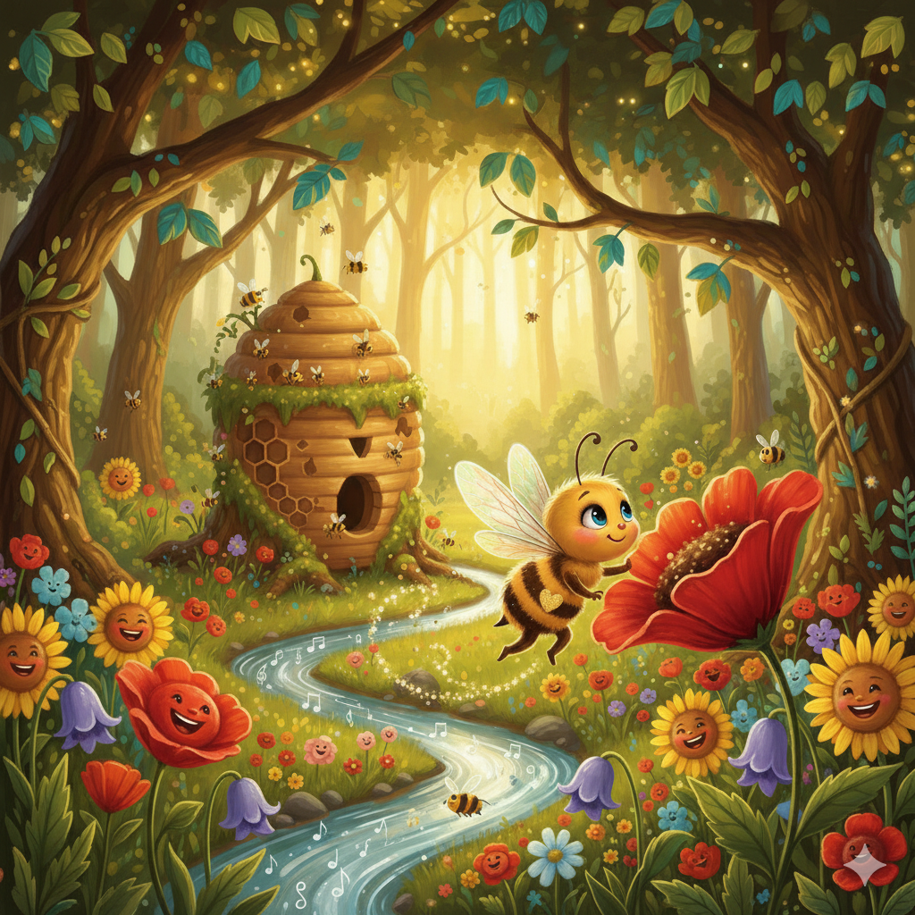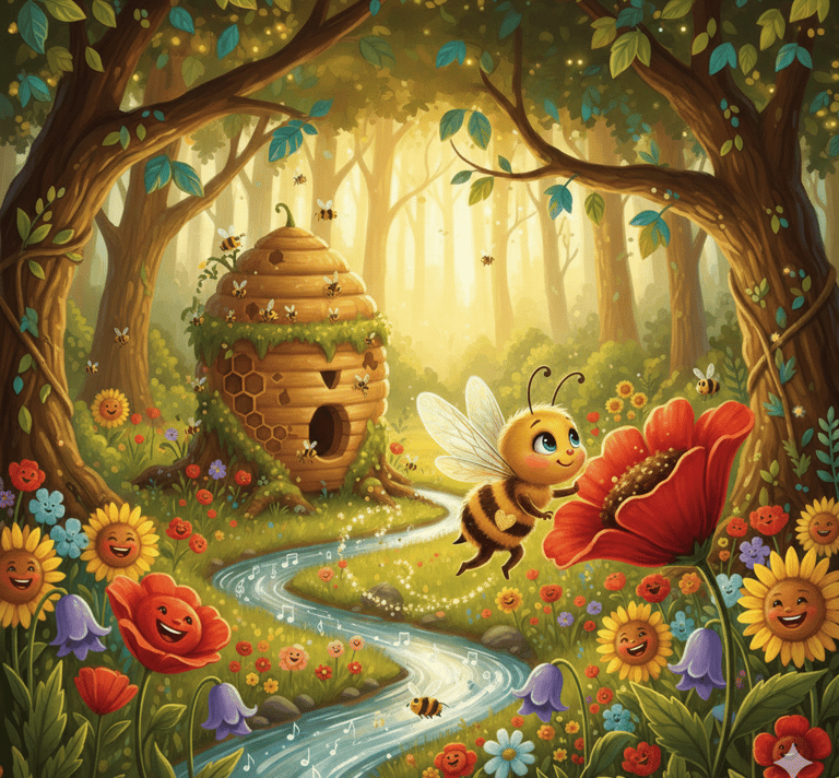 Les fleurs riaient en couleurs. Les ruisseaux fredonnaient des chansons argentées. Et dans une clairière baignait une ruche pleine d’abeilles travailleuses.